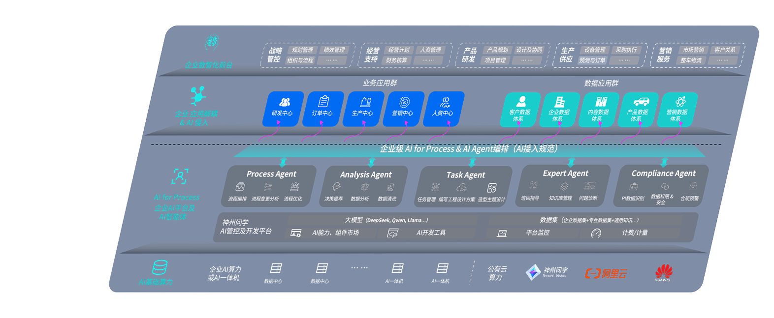 端到端的一站式AI工作空间深度融合了从企业战略规划到日常经营的全流程业务板块,,,定向解决车企内部领域多、、、、部门多、、链条长、、、场景碎片化等难题,,,支持车企快速构建以AI为核心的生产力写作体系,,,,实现任务执行与AI能力的无缝集成与交互