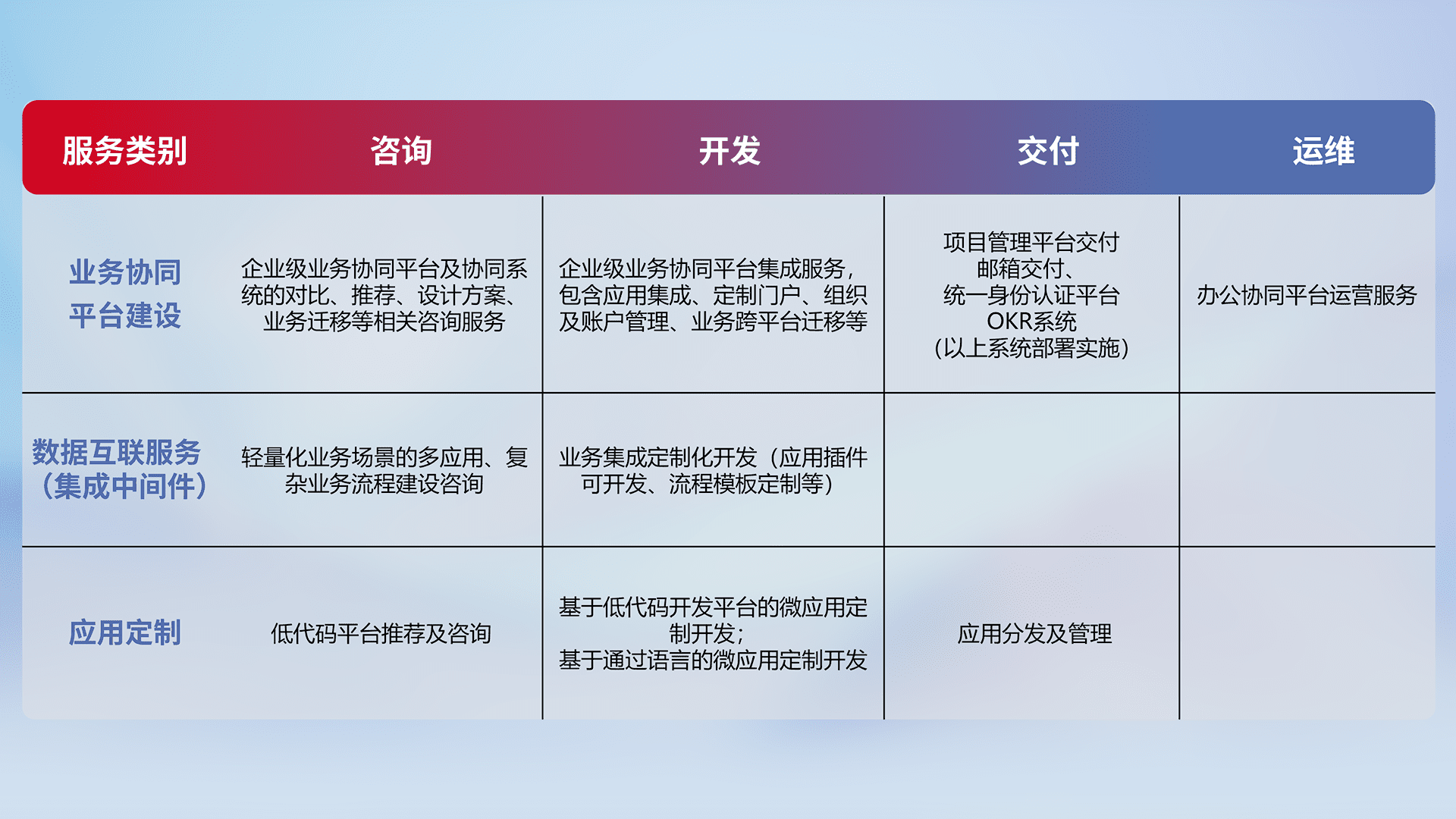 针对钉钉、、、、企微、、、、IDaas等平台级产品提供产品的规划、、方案、、交付、、、、定制化开发等服务,,实现如统一协同办公、、、、智能客户服务、、、、混合会议管理、、、智能数据查询、、、、等业务场景,,,实现数字化转型。。。